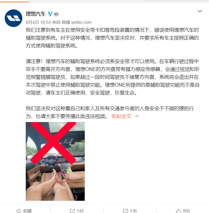 对此,理想汽车发布声明称,有车主在使用安全带卡扣等危险装置情况下,错误使用理想汽车的辅助驾驶系统。理想汽车坚决反对这种情况,并且要求所有车主按照正确的方式使用辅助驾驶系统。