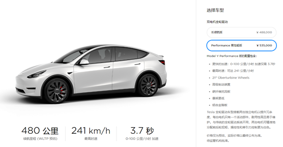 特斯拉中国官网显示,国产Model Y共有两个版本可选。长续航版售价为48.8万元人民币,续航里程为续航里程505 公里(WLTP 测算标准),百公里加速5.1 秒;Performance 高性能售价为53.5万元人民币,版续航里程480 公里(WLTP 测算标准),百公里加速3.7 秒。两款车型预计最快2021年生产。