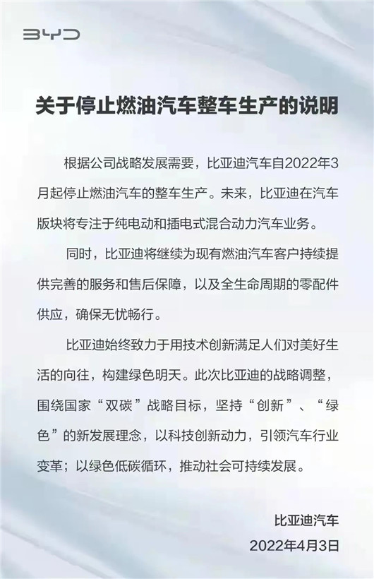 “根据公司战略发展需要,比亚迪汽车2022年3月起停止燃油汽车的整车生产。未来,在汽车版块,比亚迪汽车将专注于纯电动和插电式混合动力汽车业务。同时,比亚迪汽车将继续进行燃油汽车零部件的生产和供应,为现有燃油汽车客户持续提供完善的服务和售后保障,以及全生命周期的零配件供应,确保无忧畅行。”