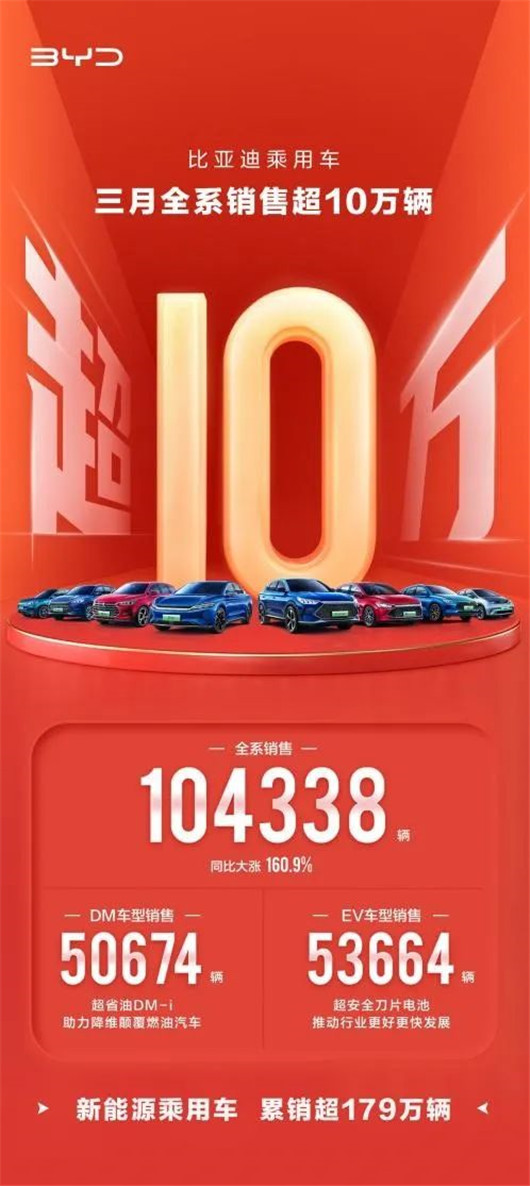 话不多说,直接上结果。从官方公布的成绩单来看,3月比亚迪全系乘用车销售104,338辆,同比增长160.9%。而这其中,DM插混新车共销售50,674辆,同比猛增615.2%。EV纯电新车共销售53,664辆,同比增长229.2%。