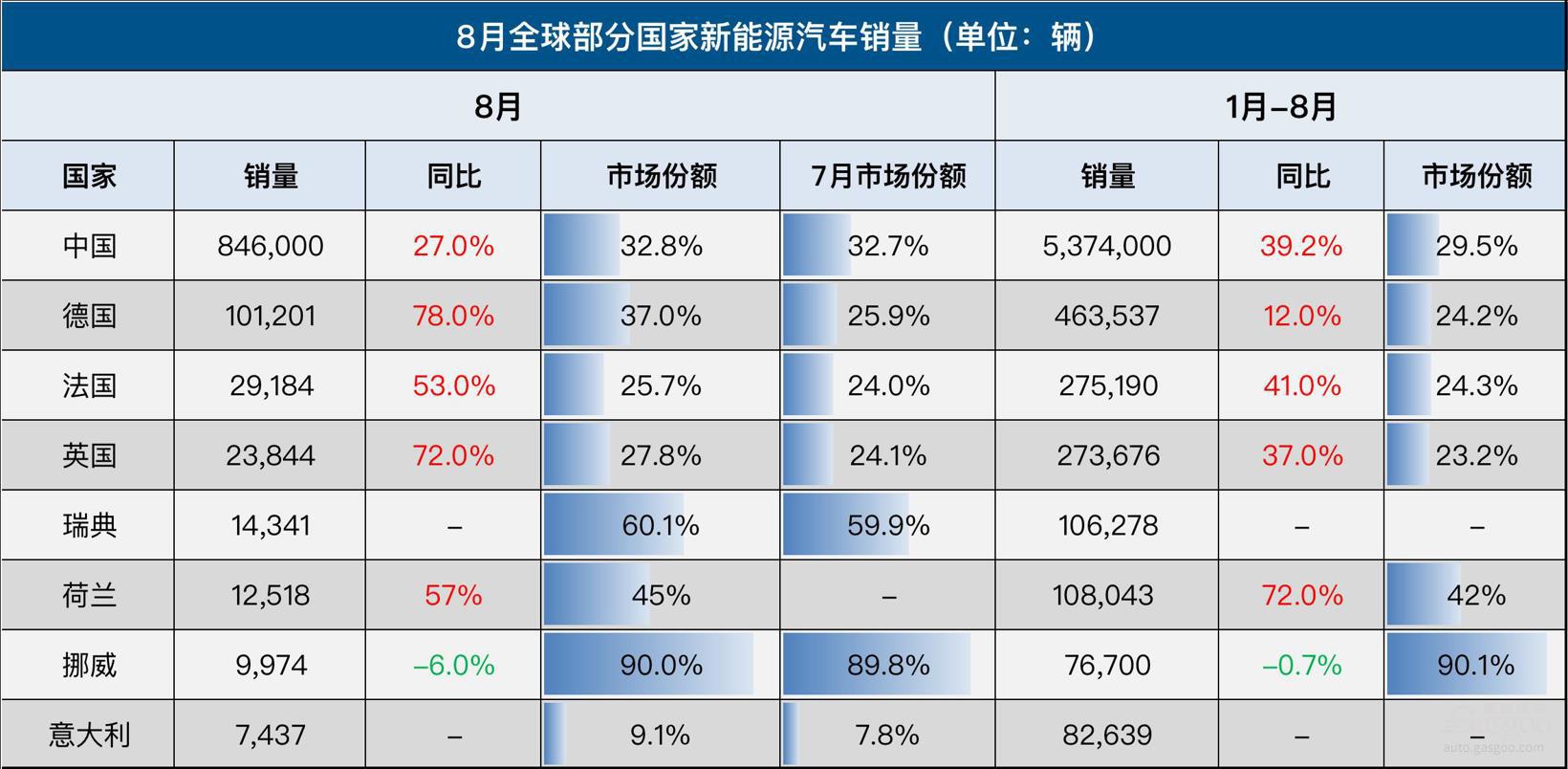 作为欧洲最大的电动汽车(包括纯电动汽车和插电式混合动力汽车)市场,德国8月电动汽车市场份额从去年同期的28.5%增长到37%,其中纯电动汽车占比高达31.7%(去年同期为16.1%)。