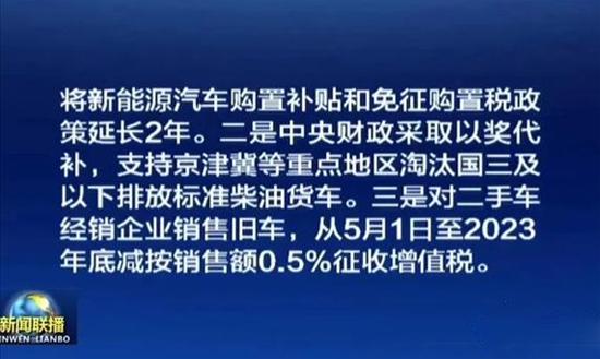 3月31日召开的国务院常务会又确定了三大举措促进汽车消费,“一是将年底到期的新能源汽车购置补贴和免征车辆购置税政策延长2年;二是中央财政采取以奖代补方式,支持京津冀等重点地区淘汰国三及以下排放标准柴油货车;三是对二手车经销企业销售旧车,从5月1日至2023年底减按销售额0.5%征收增值税”。