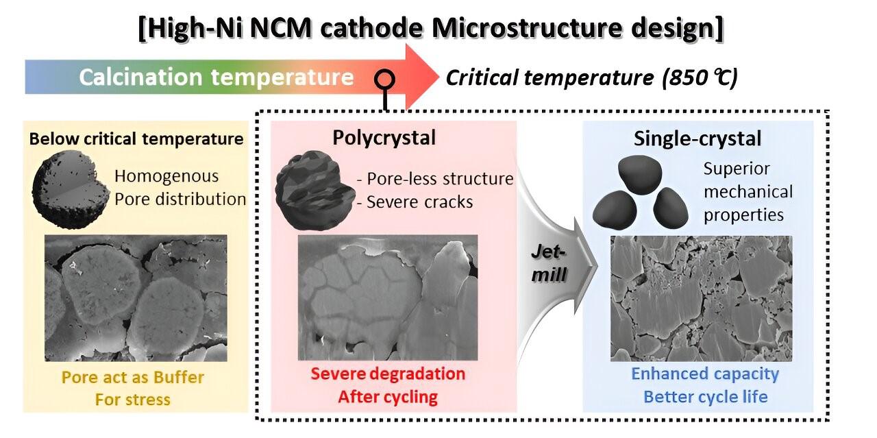 电动汽车常用的锂(Li)二次电池通过将电能转换为化学能来储存能量,并通过锂离子在阴极和阳极之间的运动将化学能释放为电能来发电。这些二次电池主要使用镍(Ni)阴极材料,因为它们具有较高的锂离子存储容量。传统的镍基材料具有多晶形态,由许多微小晶体组成,在充电和放电过程中会发生结构降解,从而显著缩短其使用寿命。