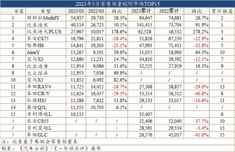 由于2023款新车即将到来,3月比亚迪宋的销量环比有所减少,仅为40,114辆,于是被Model Y被挤至第2。不过,因前两个月销量均稳定在5万辆左右,一季度宋的总销量达到14.1万辆,继续在累计榜单中居于第一。接下来,随着Model Y销量的回落和自身2023款新车的上市,比亚迪宋应该会迅速夺回SUV的冠军头衔,并将在累计榜单中称霸。