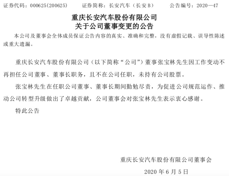 6月5日,重庆长安汽车股份有限公司(000625,简称:长安汽车)发布关于公司董事变更的公告。公告称,原中国兵器装备集团副总经理、长安汽车董事长张宝林因工作变动不再担任公司董事、董事长职务,且不在公司任职,未持有公司股票。