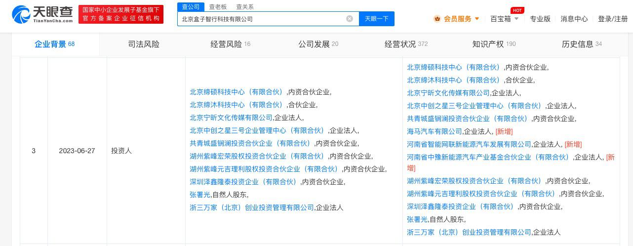 车域星航从天眼查App获悉,日前,北京盒子智行科技有限公司(以下简称盒子智行)发生工商变更,新增海马汽车有限公司、河南省中豫新能源汽车产业基金合伙企业(有限合伙)、河南省智能网联新能源汽车发展有限公司为投资人,同时公司注册资本由约2.25亿人民币增至约5.06亿人民币,增幅约125%。