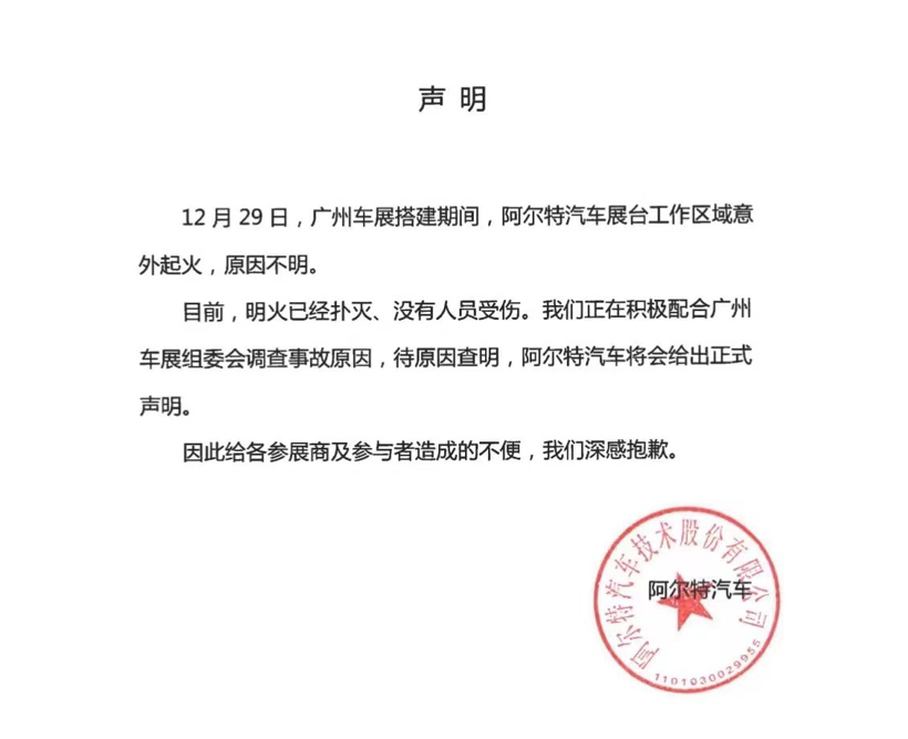 随后阿尔特发布官方声明指出,汽车展台工作区域意外起火,原因不明。目前明火已经扑灭,没有人员受伤。广州车展组委会已启动事故调查,原因尚待查明。