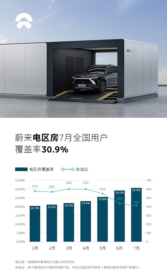 截至7月底,蔚来换电站的车站比数值相比4月下降30%,平均每个换电站覆盖424名用户。随着换电站的不断增加,车站比也会持续下降。