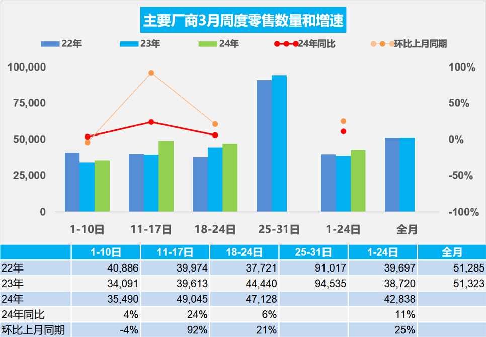 乘联会统计数据显示,3月1-24日,乘用车市场零售102.8万辆,同比去年增长11%,环比上月增长25%。新能源车市场零售49万辆,同比增长39%,环比增长84%,市场渗透率超47%。